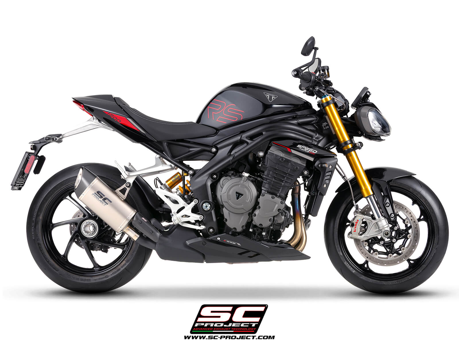 Our SC1-R GT silencer is designed and crafted to let you feel all SC-Project racing experience, through the deep and enhanced three cylinder symphony of the engine of the new Speed Triple 1200 RS, in full compliance with Euro 5+ regulations.